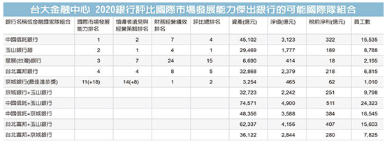 銀行評比結果顯示,國際市場發展能力排名第一的中信銀行即使財務績效滑落,但總排名仍第四名。玉山銀行國際市場發展能力名列第二,總排名也勇奪冠軍。星展銀行承接體質差銀行,但領導者遠見進步神速,國際市場發展排名亮眼。台北富邦銀除財務績效及領導者遠見穩定維持外,國際市場發展能力則大幅上升。