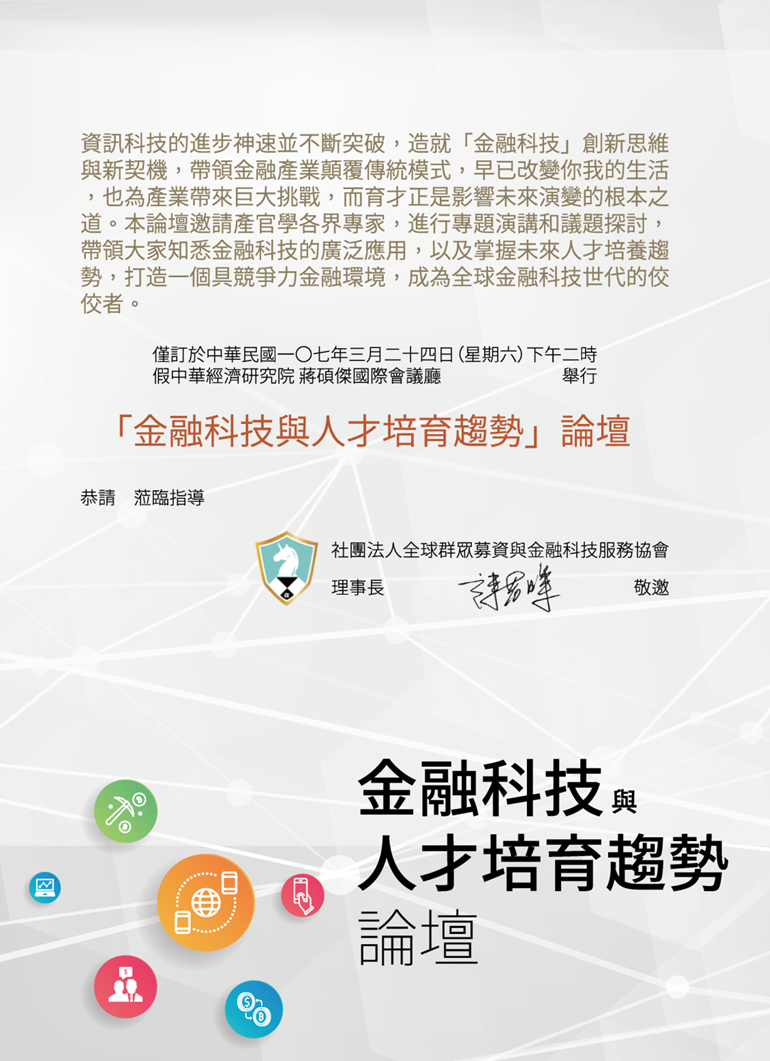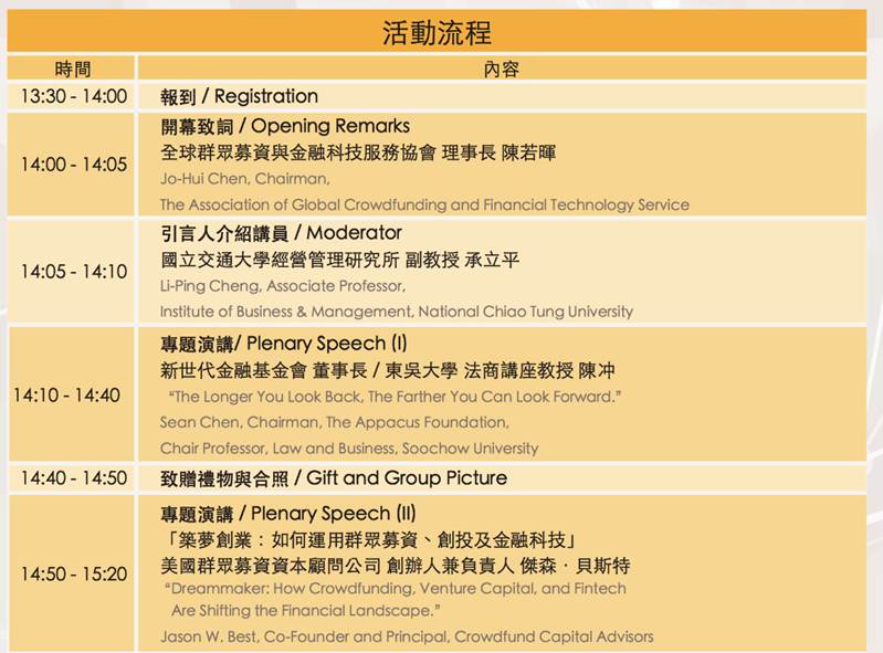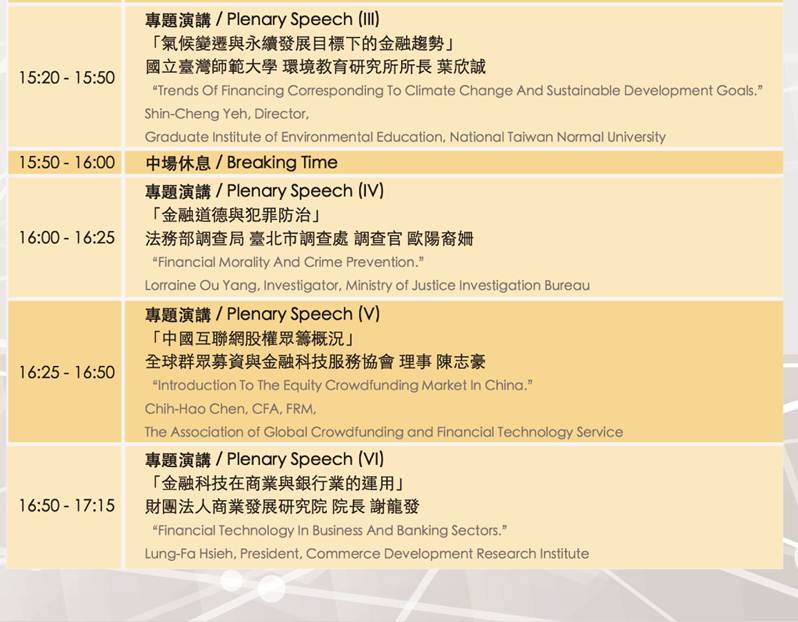 本論壇與中原大學財務金融學系、中華經濟研究院及美國在台協會共同合作,邀請產官學各界專家學者進行各種專題演講和議題探討,論壇特別邀請到新世代金融基金會董事長/東吳大學法商講座教授陳冲探討「全球金融變局與未來發展趨勢」、美國群眾募資資本顧問公司創辦人傑森.貝斯特分享「築夢創業:如何運用群眾募資、創投及金融科技」、等各專家分享。