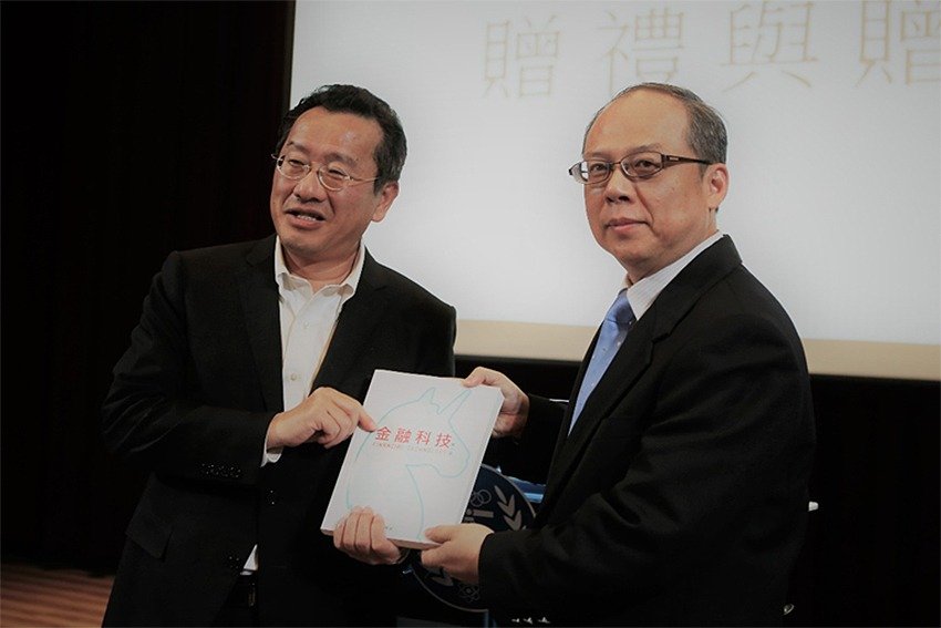 全球群眾募資與金融科技服務協會理事長陳若暉(右)教授著作「金融科技」一書,代表協會致贈金管會主委顧立雄
